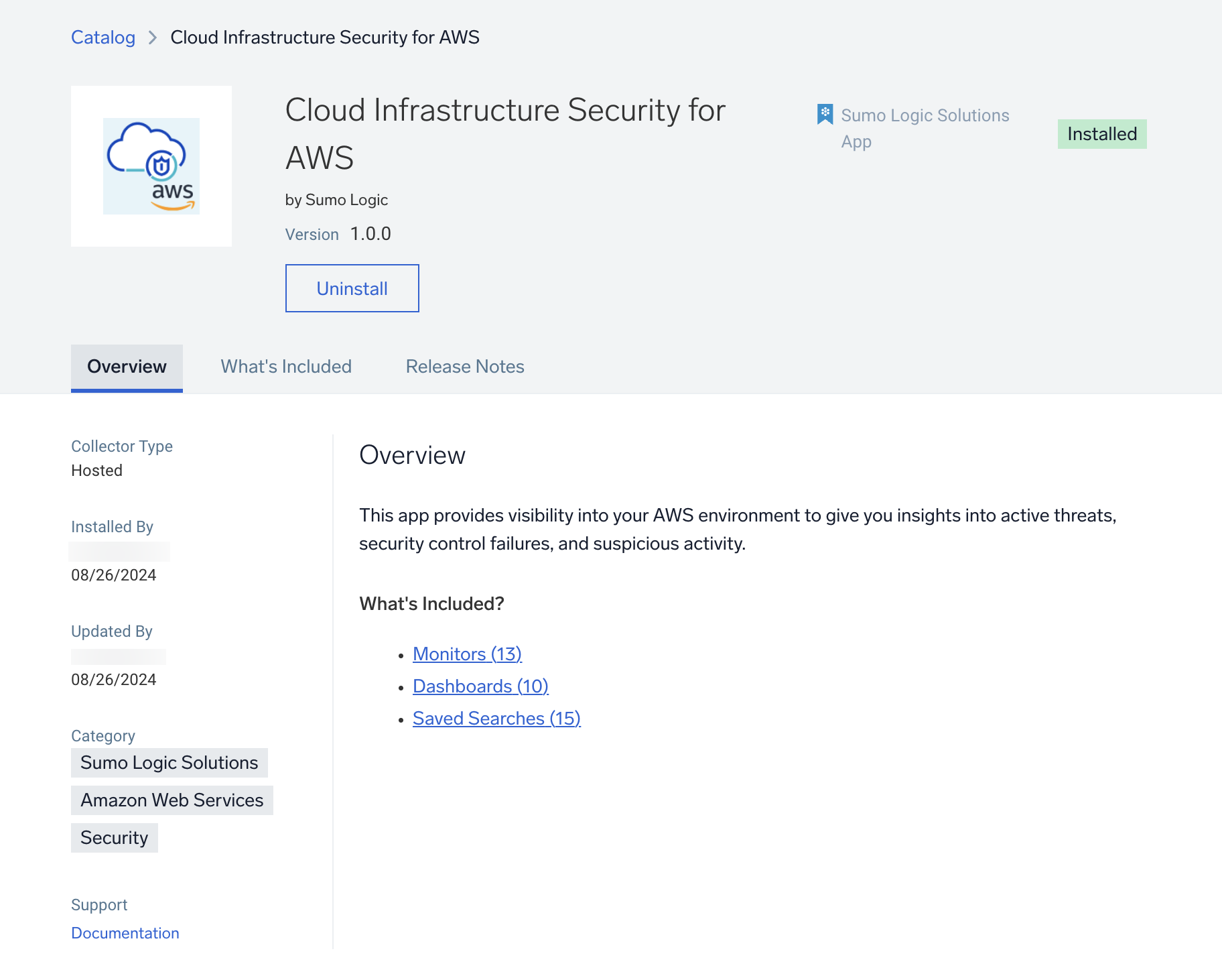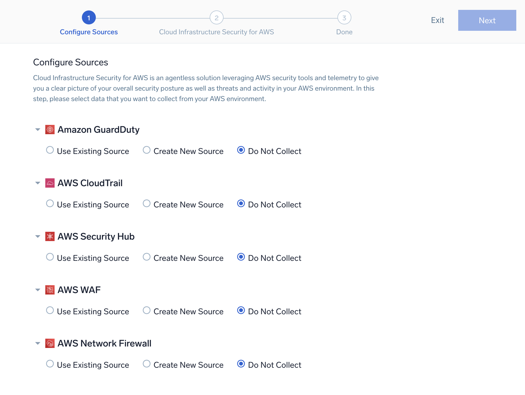 - If you have already installed the Amazon Security Quickstart, collectors may be duplicated to collect from the same sources. To prevent this, use the existing source category for collection.