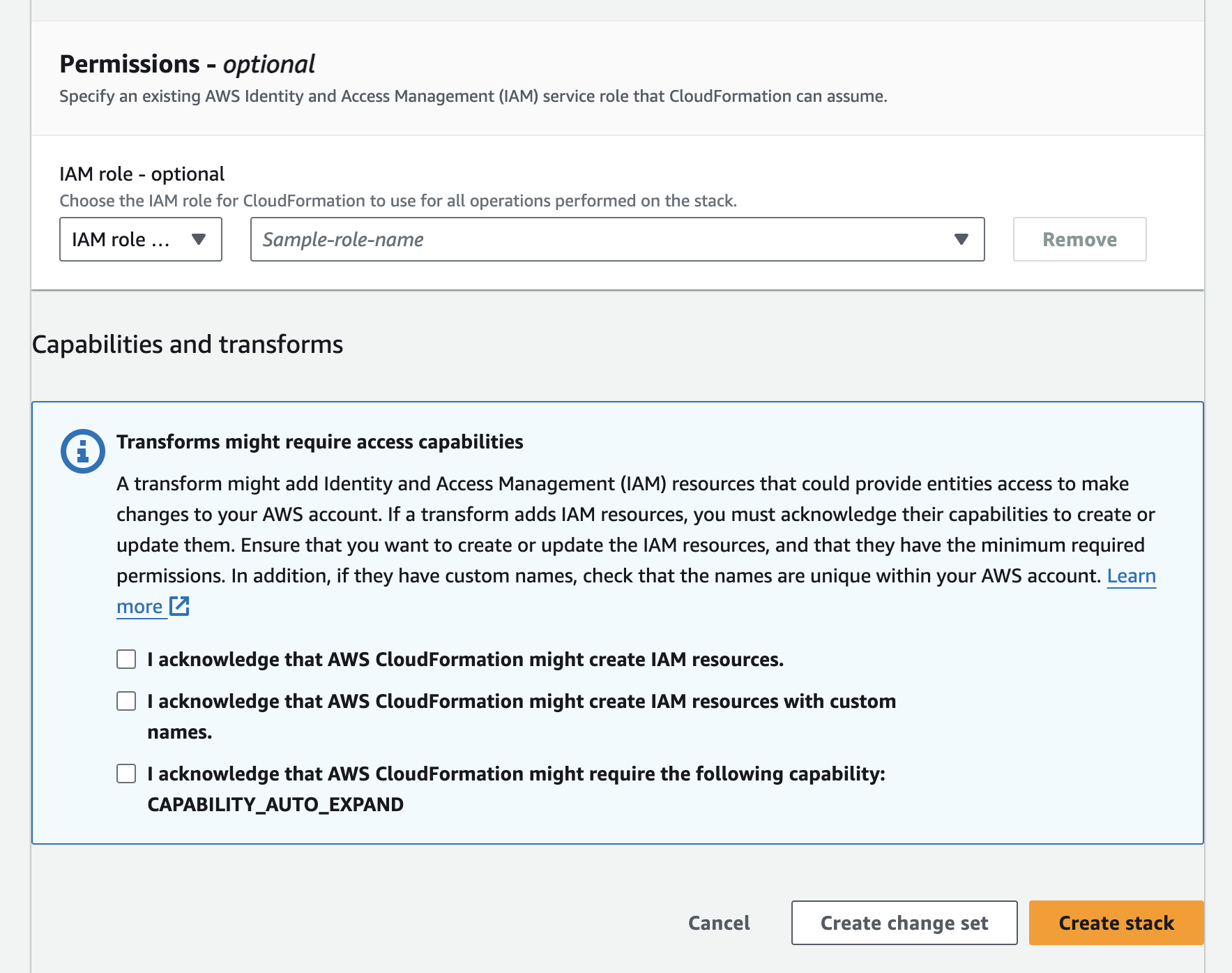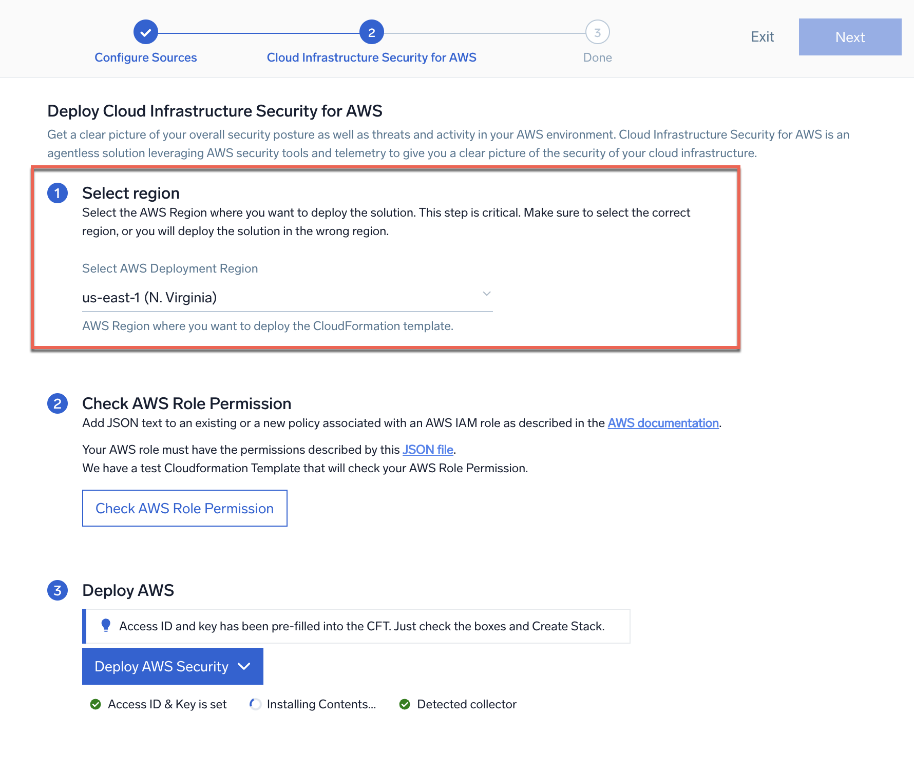 - AWS credentials. To deploy the solution, you will need to log onto the AWS Console. For the CloudFormation template deployment, your AWS role must have the permissions described by this JSON file. As necessary, you may add JSON text to an existing or a new policy associated with an AWS IAM role as described in the AWS documentation. You can set this up during installation. For more information, see Create new source: Check AWS role permission.