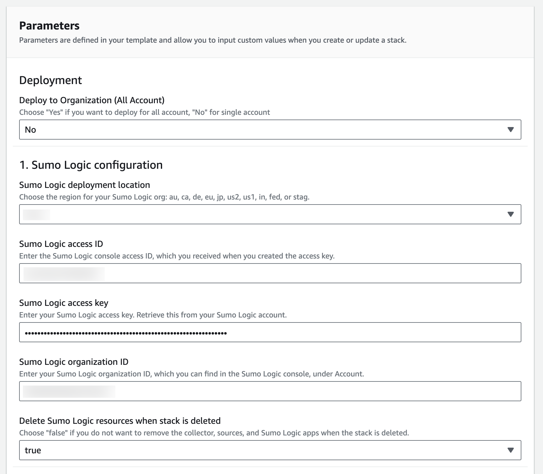 - Sumo Logic resources are deleted based on the “Delete Sumo Logic Resources when the stack is deleted” flag provided during the AWS CloudFormation configuration. These resources include dashboards, collectors, and sources.