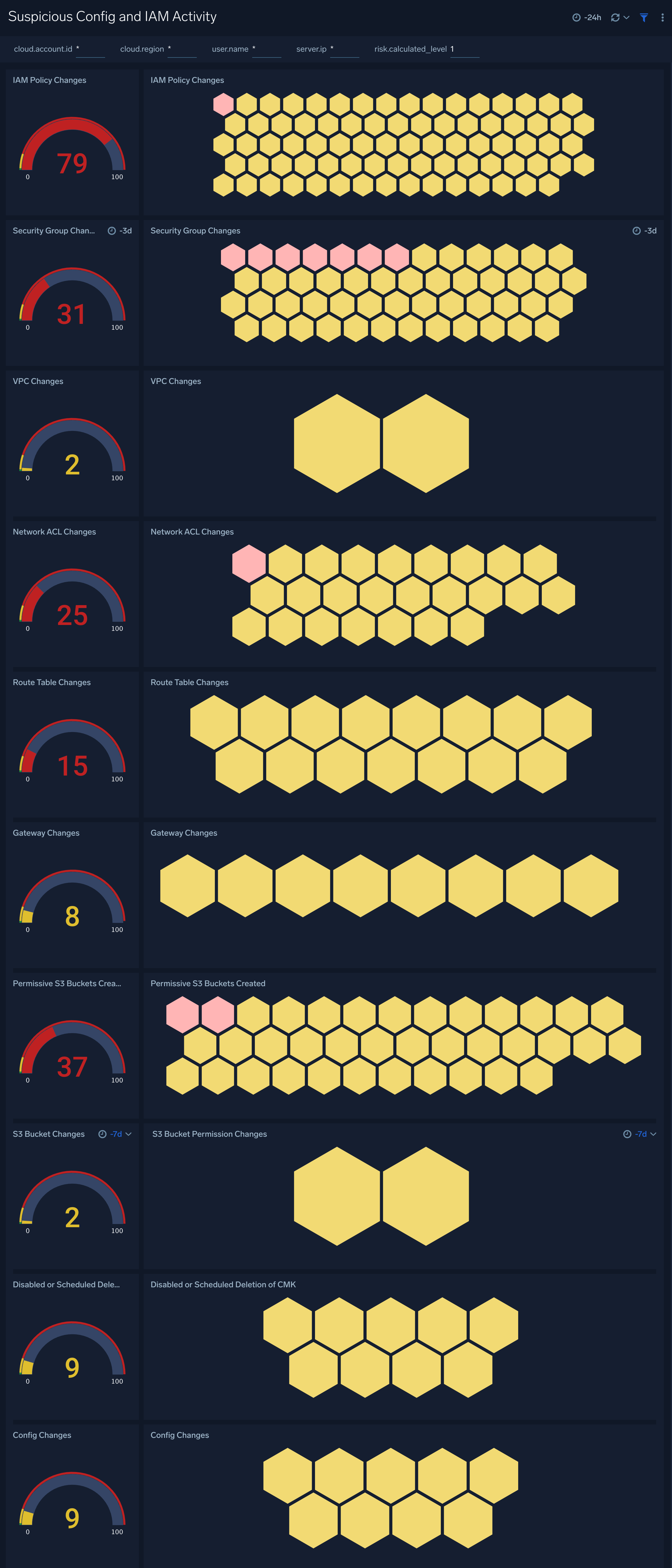 The Suspicious Config and IAM Activity dashboard shows suspicious changes for configurations and Identity Access Management (IAM). It shows suspicious changes in IAM policies, security groups, VPCs, network ACLs, route tables, gateways, S3 bucket permissions, deletion of CMK, and configurations.