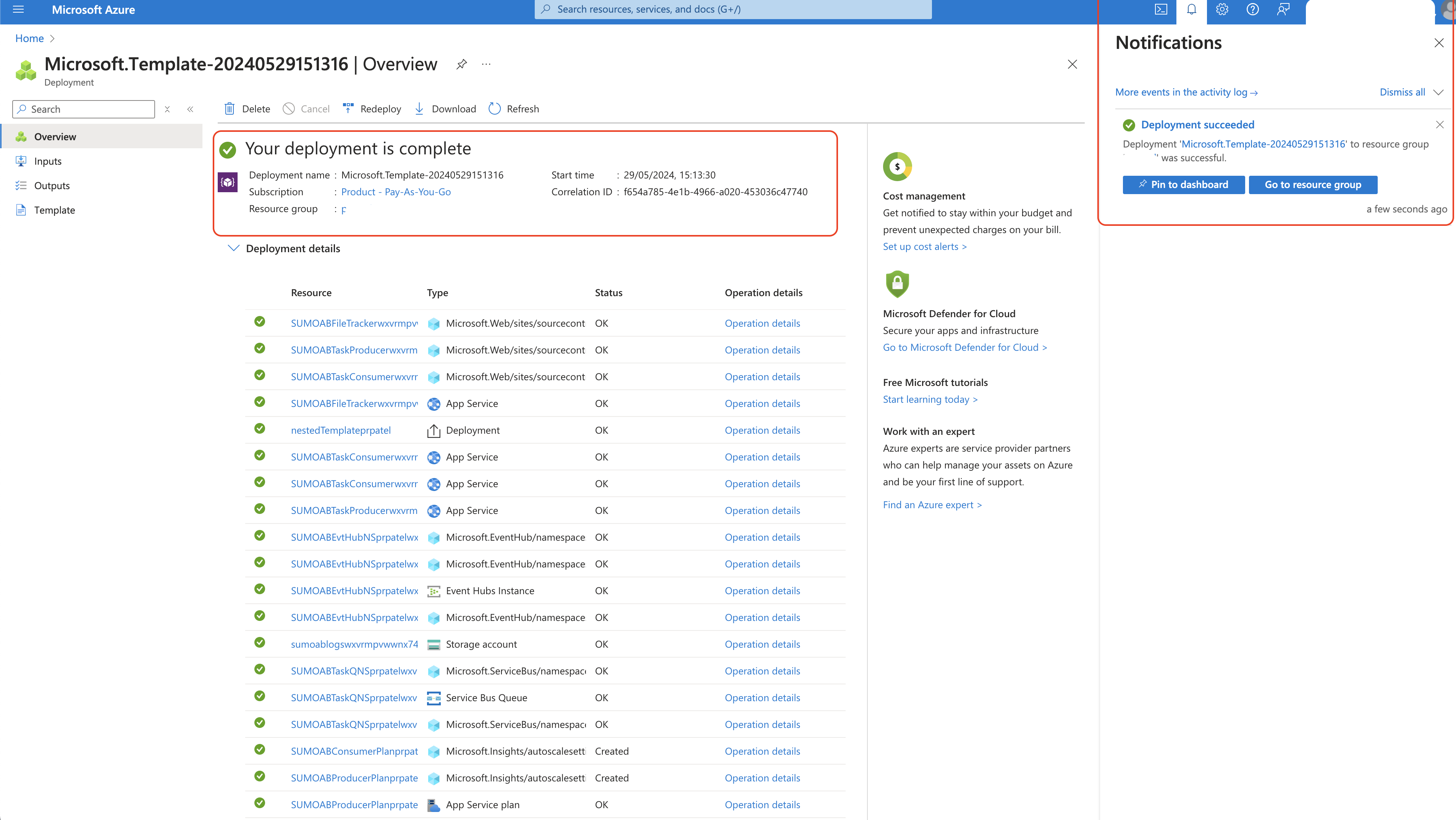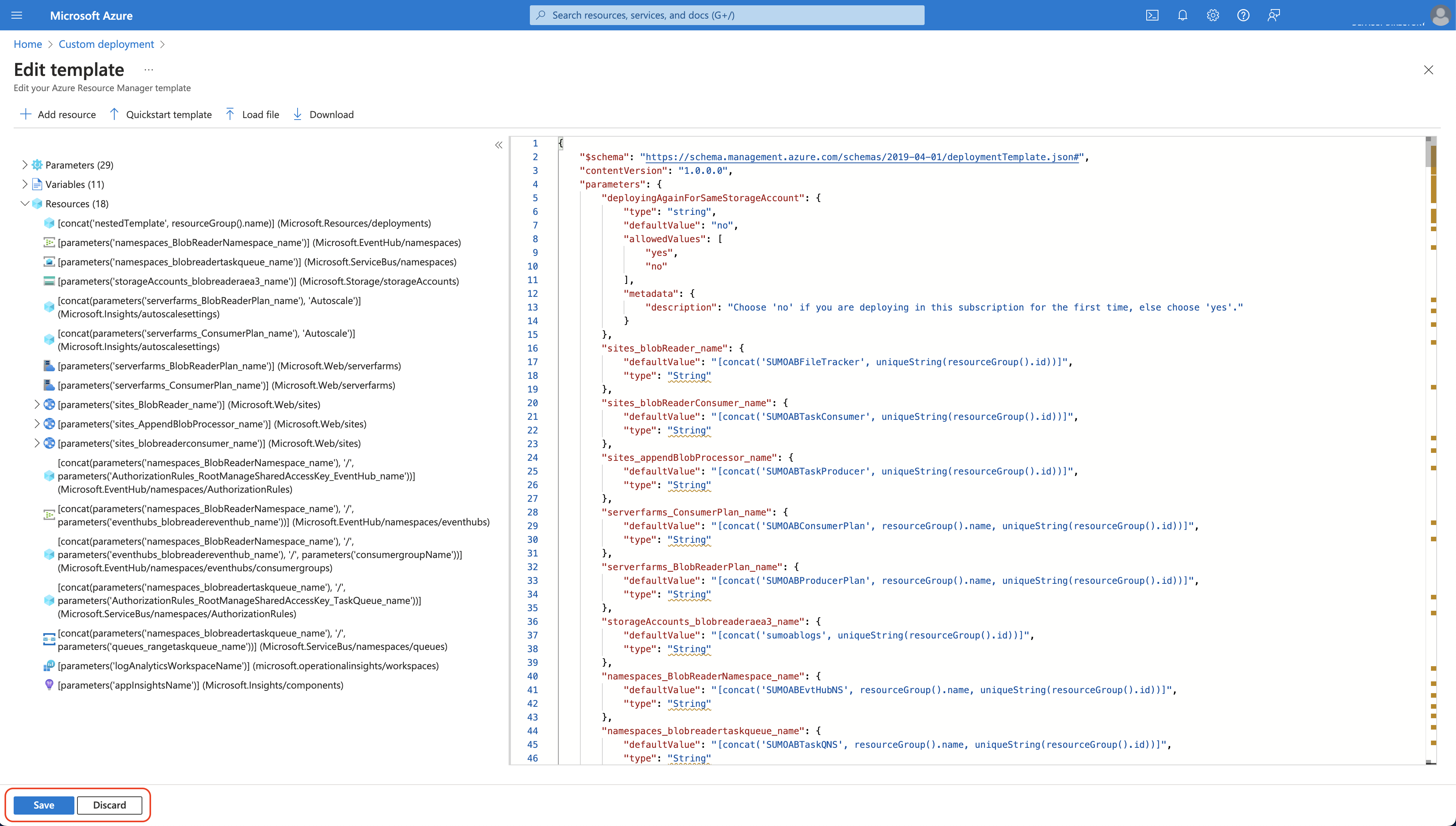 In this step, you use a Sumo Logic-provided Azure Resource Manager (ARM) template to create an Event Hub, three Azure functions, a Service Bus Queue, and a Storage Account.