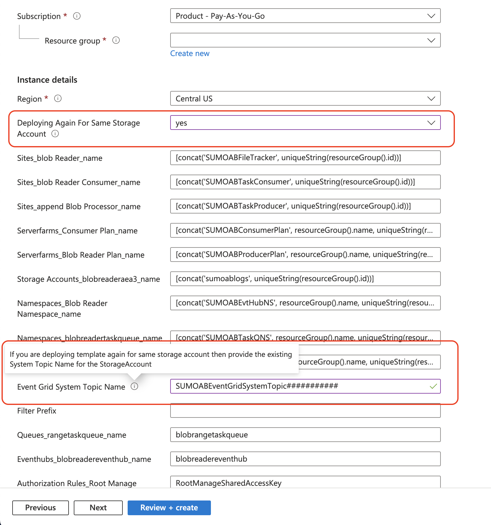 - DeployingAgainForSameStorageAccount. Choose 'yes' if you are deploying the ARM template again for the same storage account, else choose 'no'.