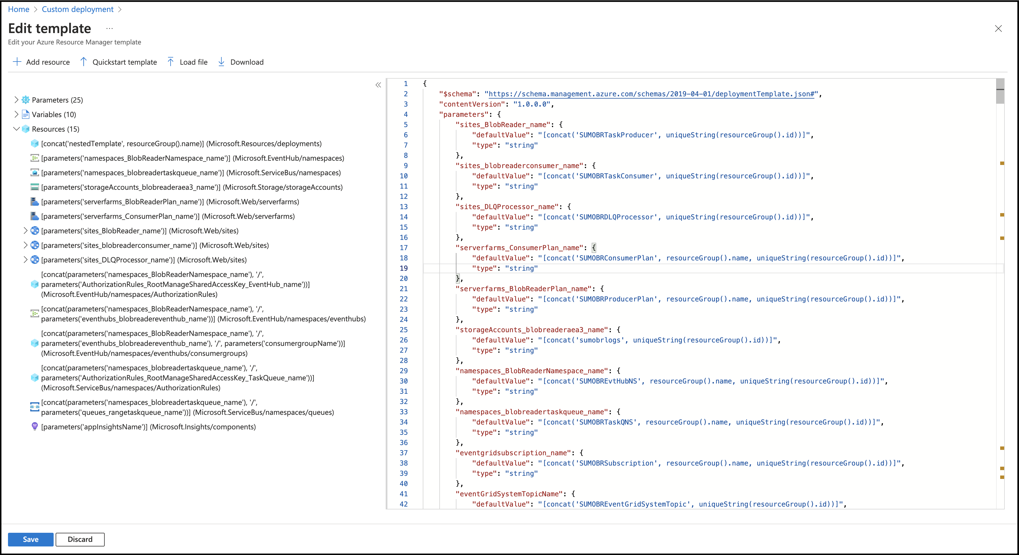 In this step, you use a Sumo Logic-provided Azure Resource Manager (ARM) template to create an Event Hub, three Azure functions, Service Bus Queue, and a Storage Account.