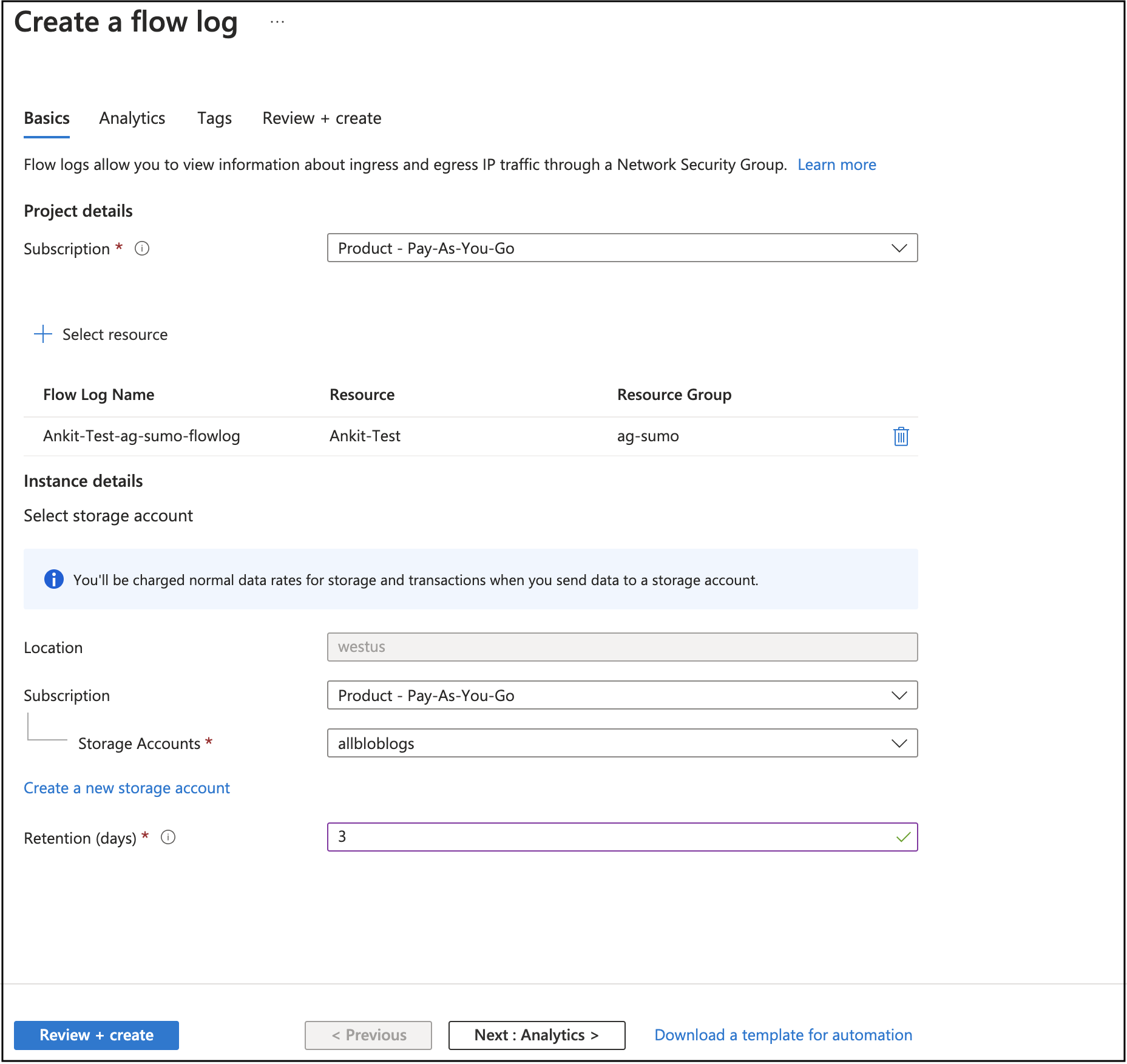 Example: Push NSG flow logs from a Network Security Group to Azure Blob Storage