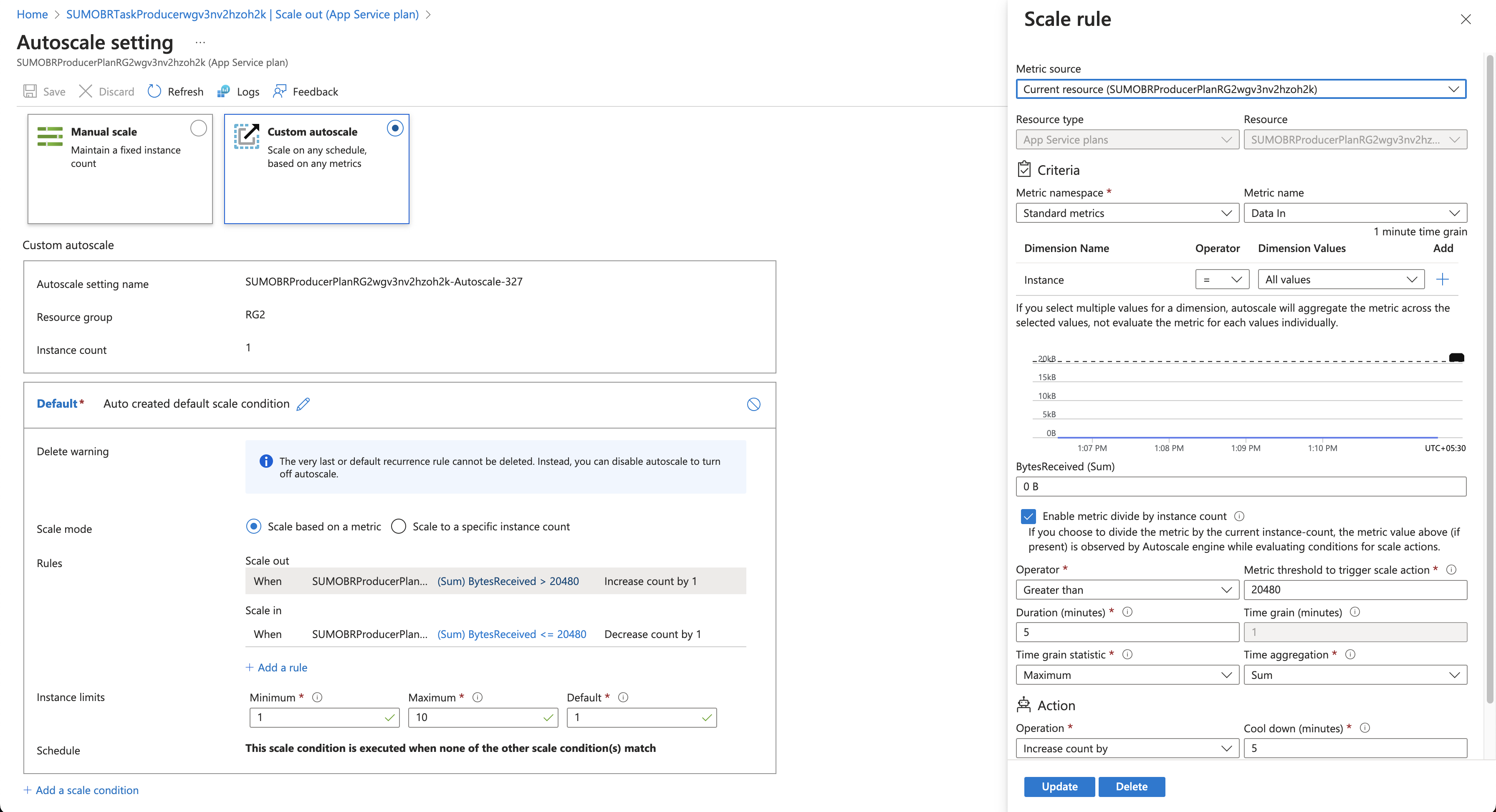 - Add your rules based scaling configuration as defined in Create your first autoscale setting.