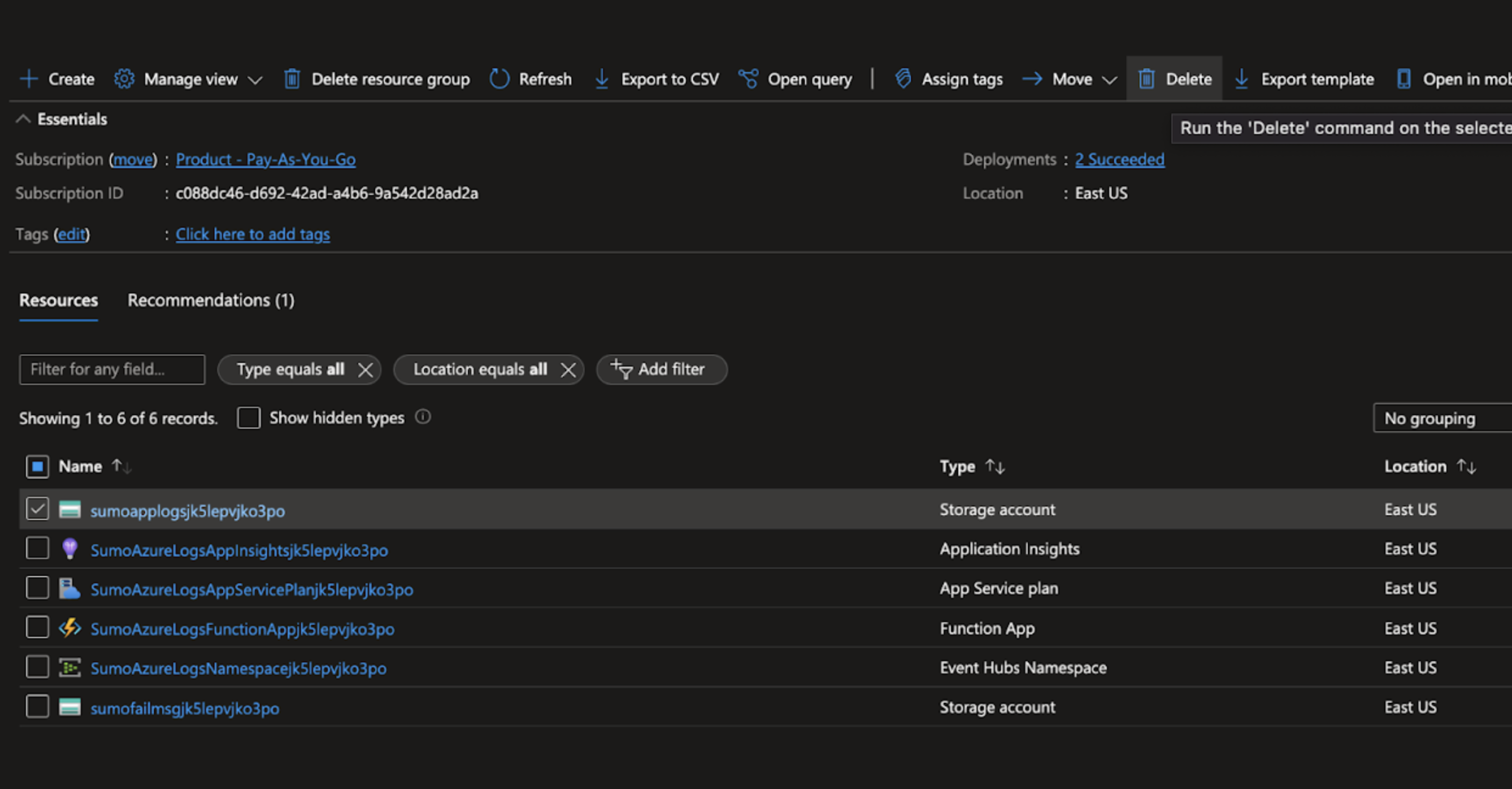 If you see more resources than the ones shown in the above screenshot you can delete all six individual resources (the ones with the prefix sumo) one by one by selecting each resource and clicking on the Delete button at the top bar.