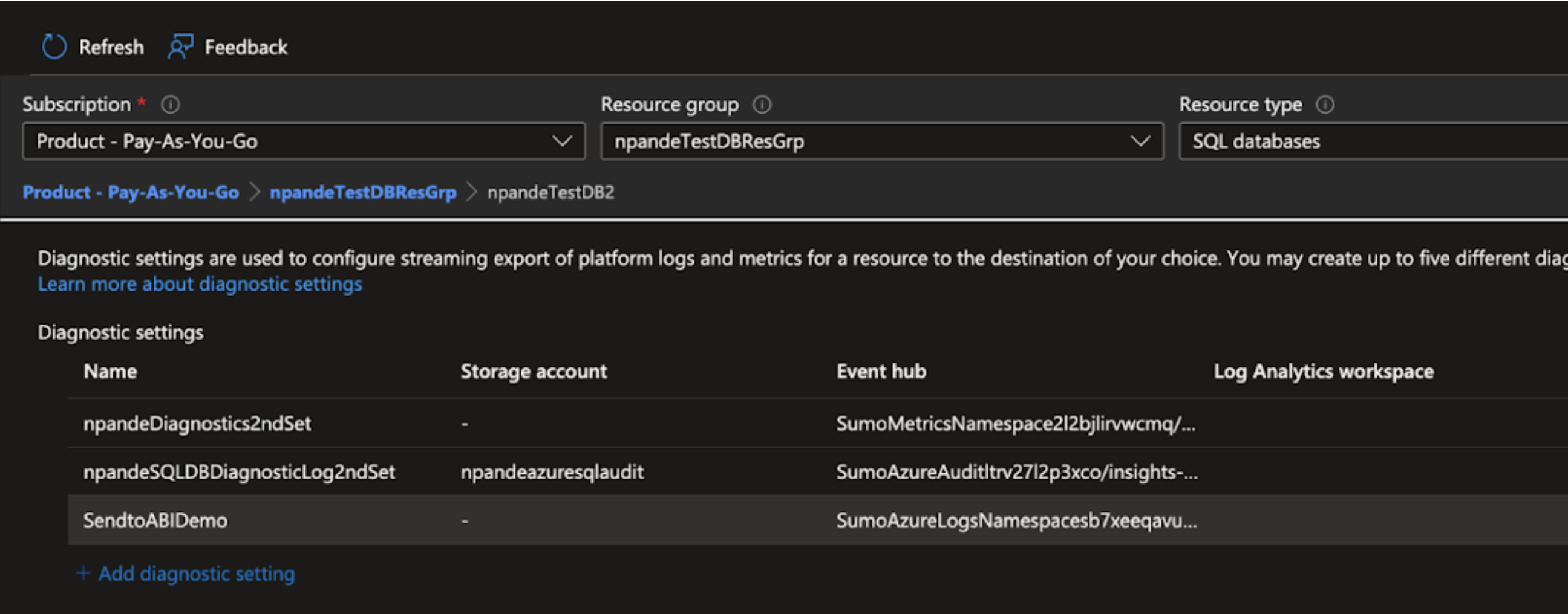 - Select the resource name (whose logs you are ingesting into sumo) it shows a list of diagnostic settings.
