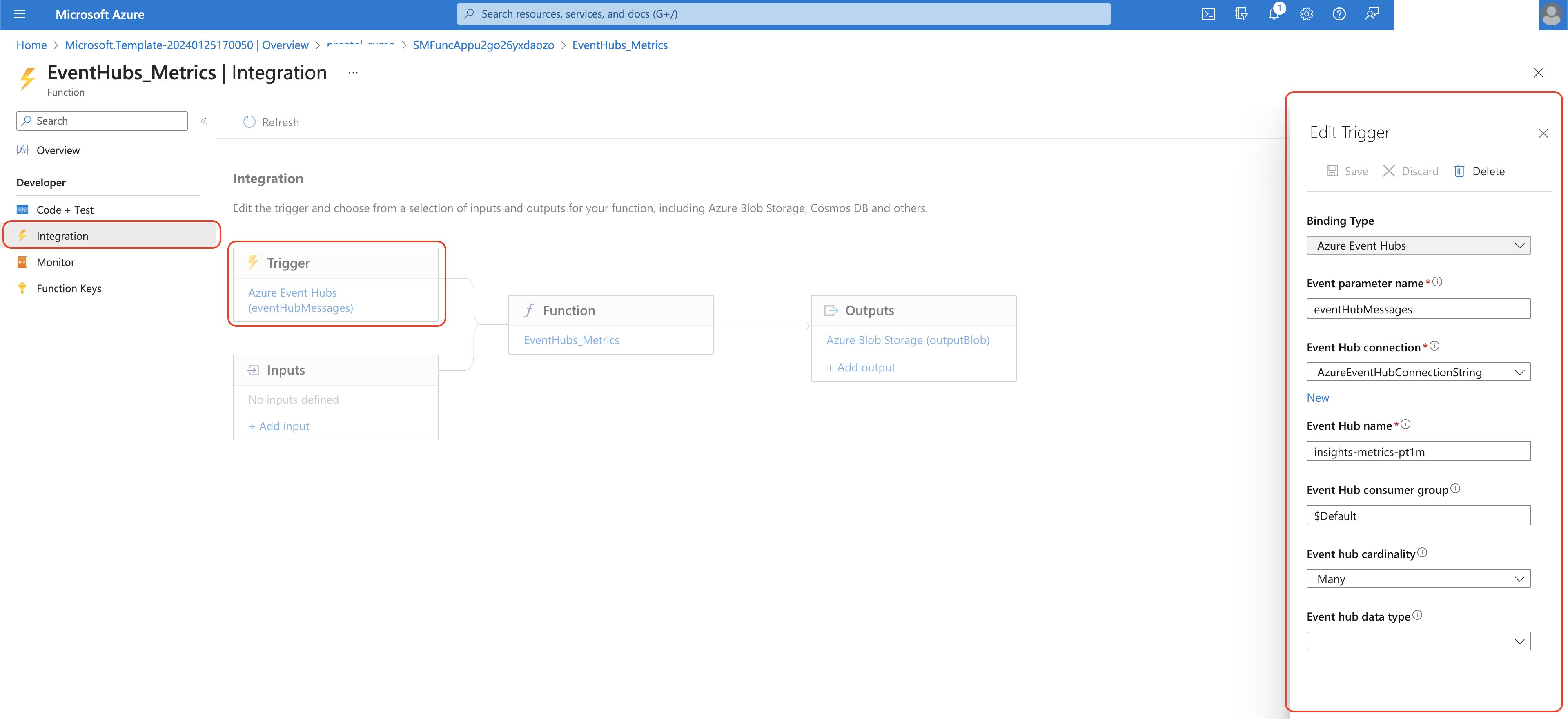 SMFuncApp. You should find theSMFuncApp<random-string>Function App. Click it. - Under the Functions tab, click EventHubs_Metrics.