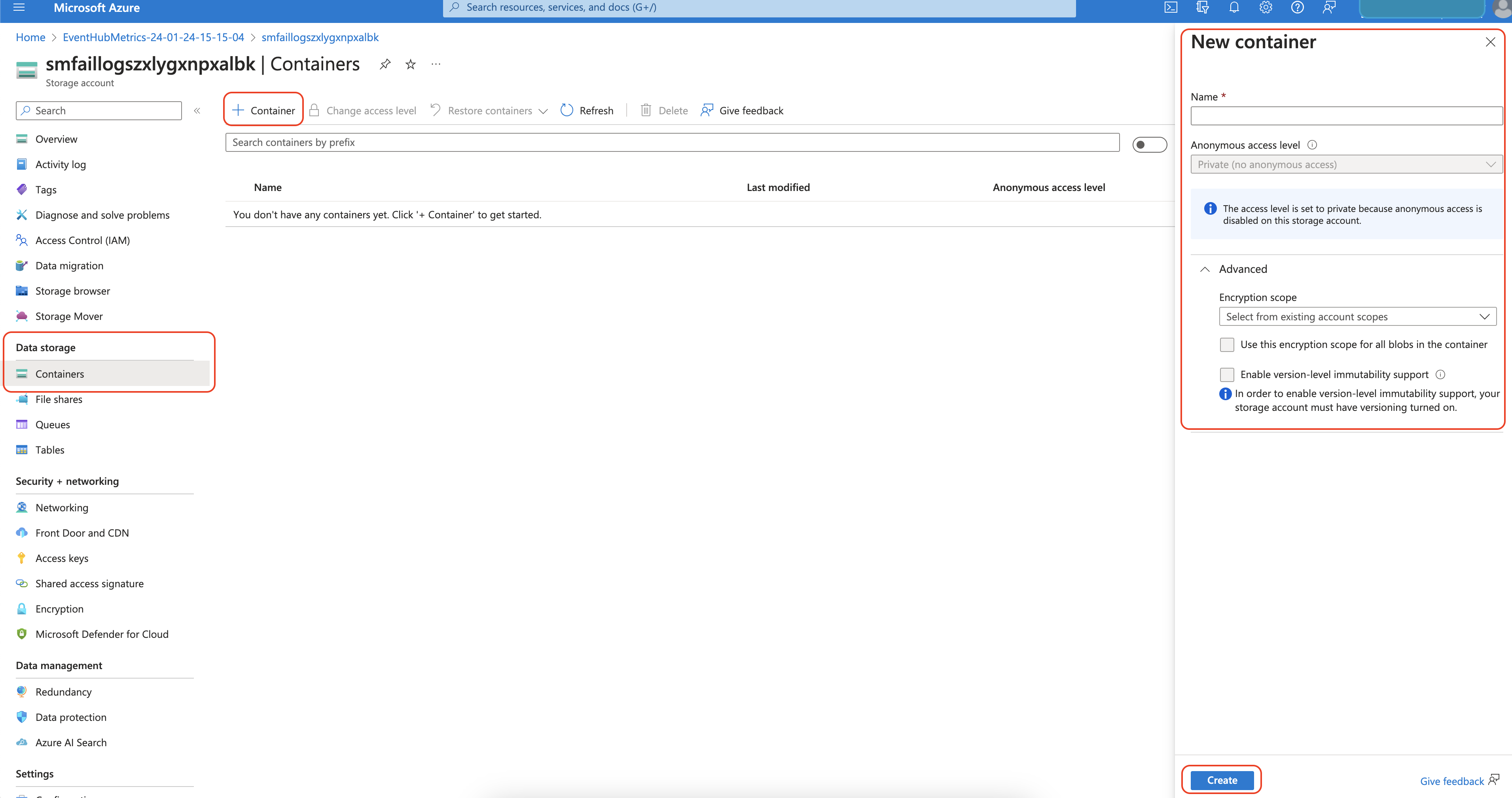 - Under Data Storage, click Containers, then click + Container, enter the Name