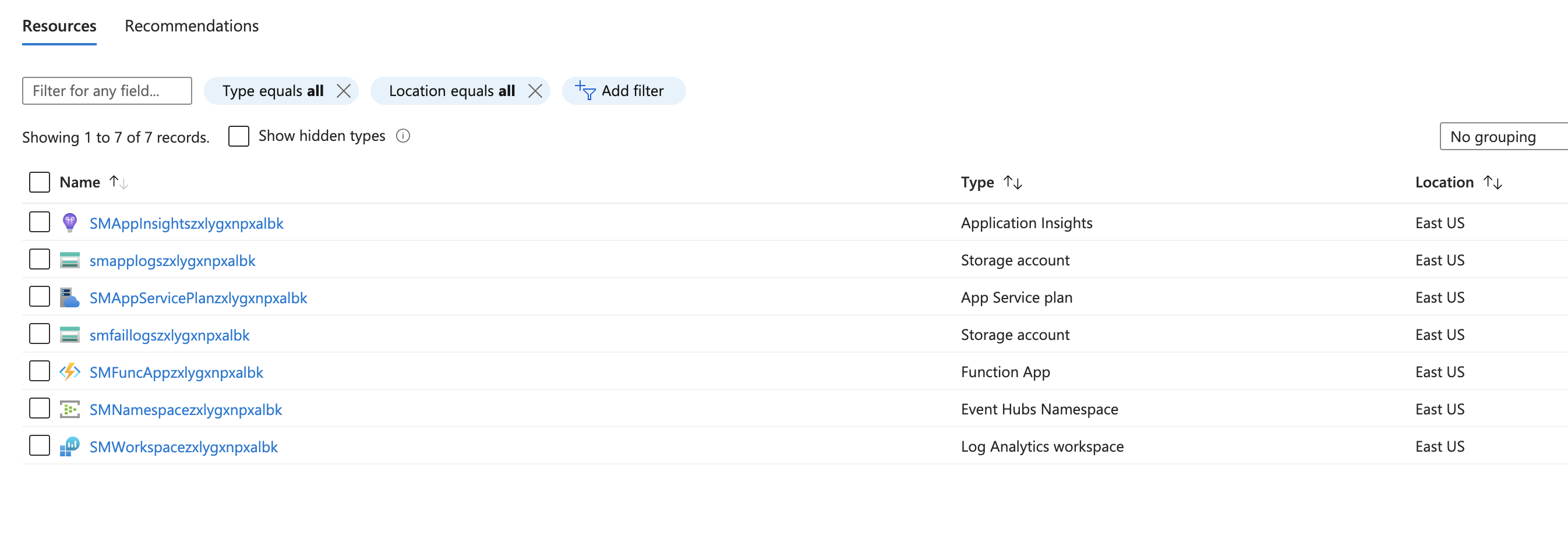 Go to Resource groups, and select the resource group you created or selected in Step 2. Configure Azure resources using ARM Template. You should see the seven resources you created: an App Service plan, an App Service, an Event Hubs Namespace, Application Insights, Log Analytics workspace and two Storage accounts.