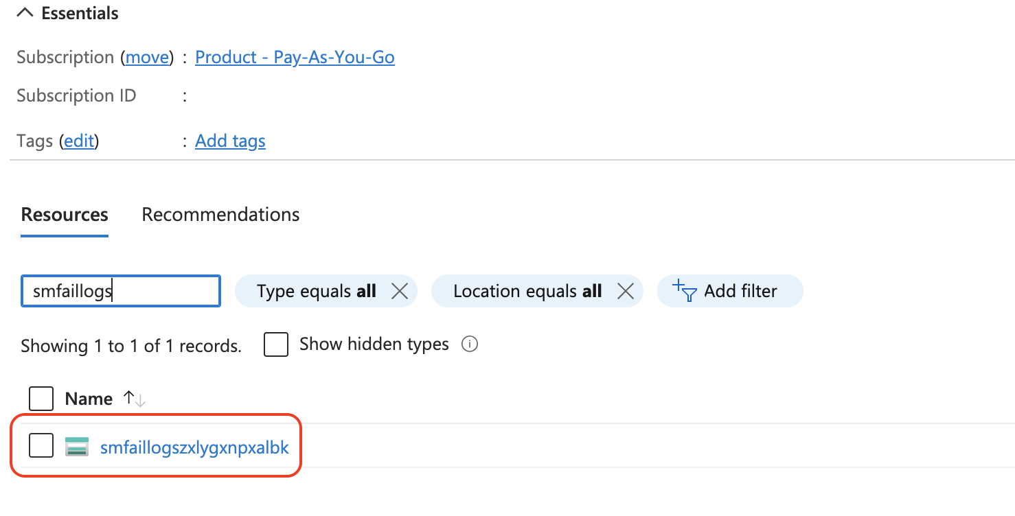 smfaillogsin Resources Tab. Click onsmfaillogs<random-string>storage account.