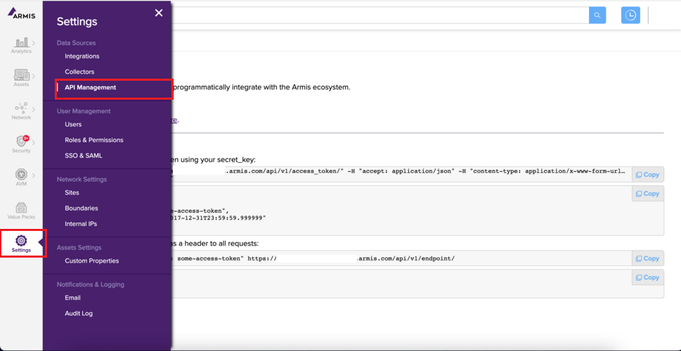 In this configuration, you will set up an Armis source account and configure it to be authorized and authenticated to use device logs and alerts from Armis API. To obtain an Armis auth token, follow the steps below: