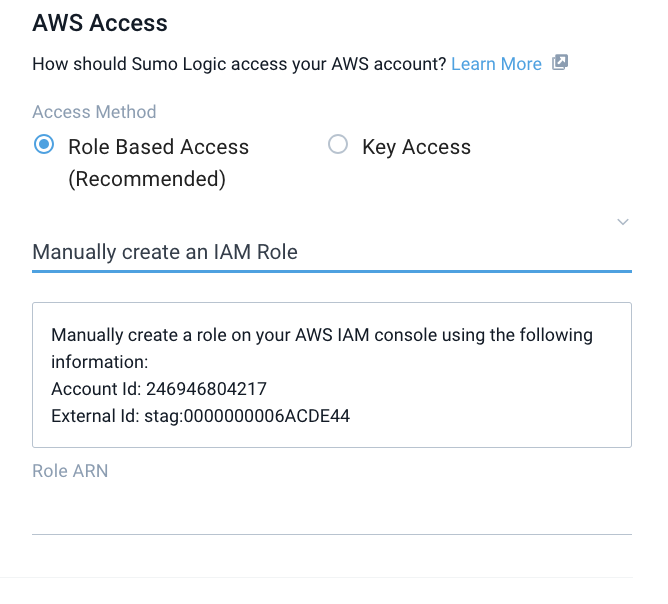 - Role Based Access. AWS Role ARN is required for Role based Access. Use the information provided on the source page to configure the role.