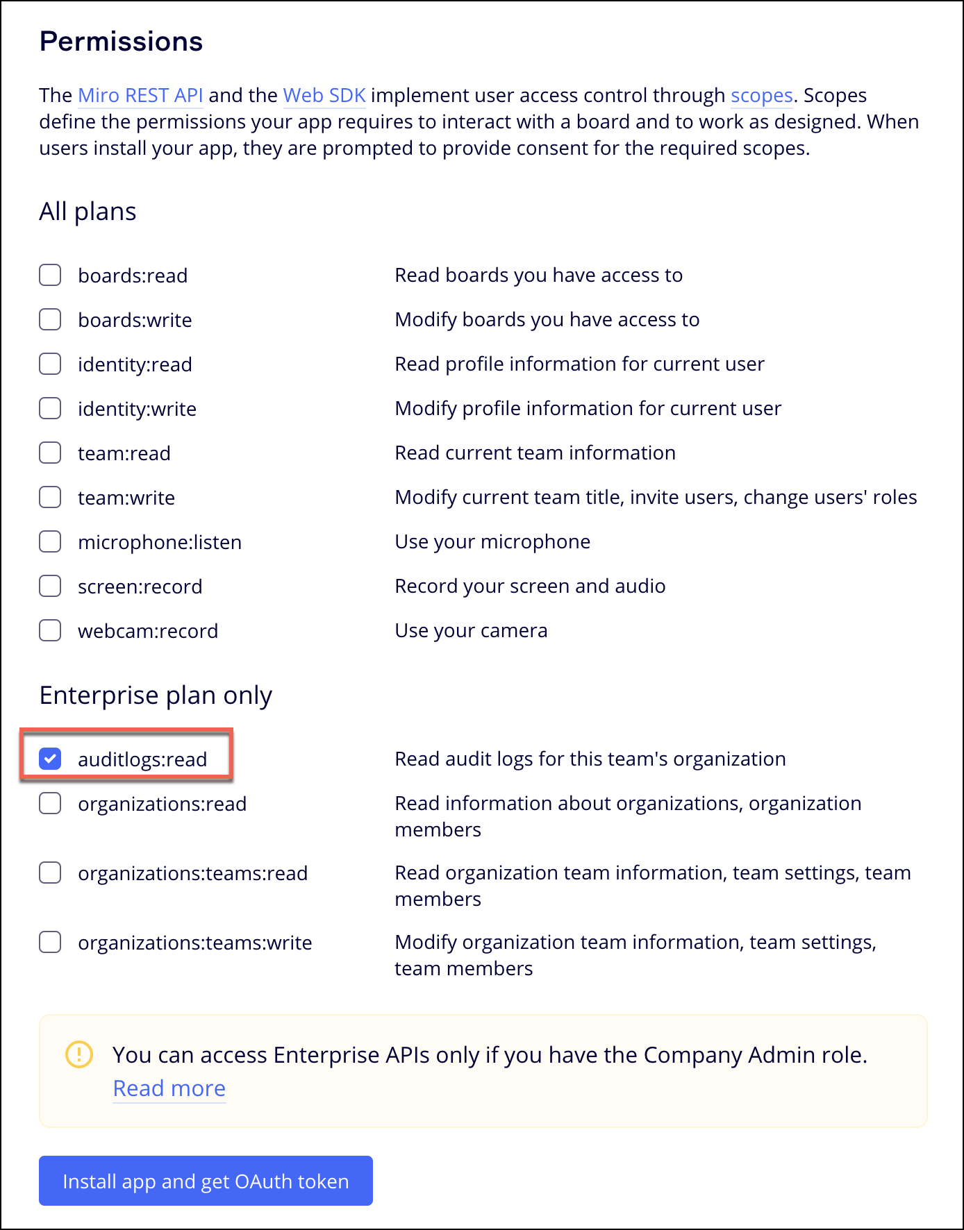- After the app is created, go to the Permissions tab in app settings and select auditlogs:read checkbox to enable scope.