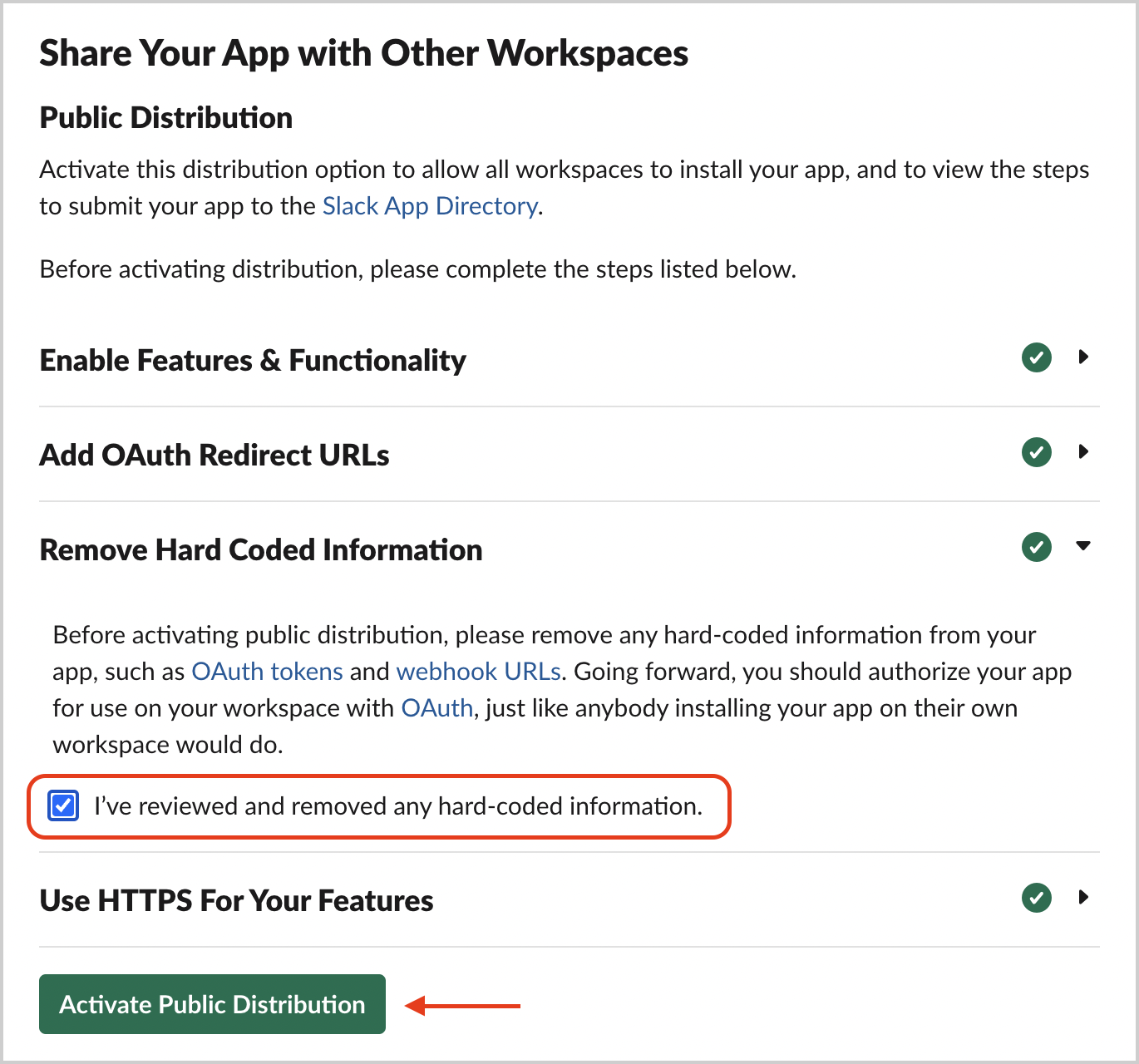I’ve reviewed and removed any hard-coded information checkbox. Click the Activate Public Distribution button.