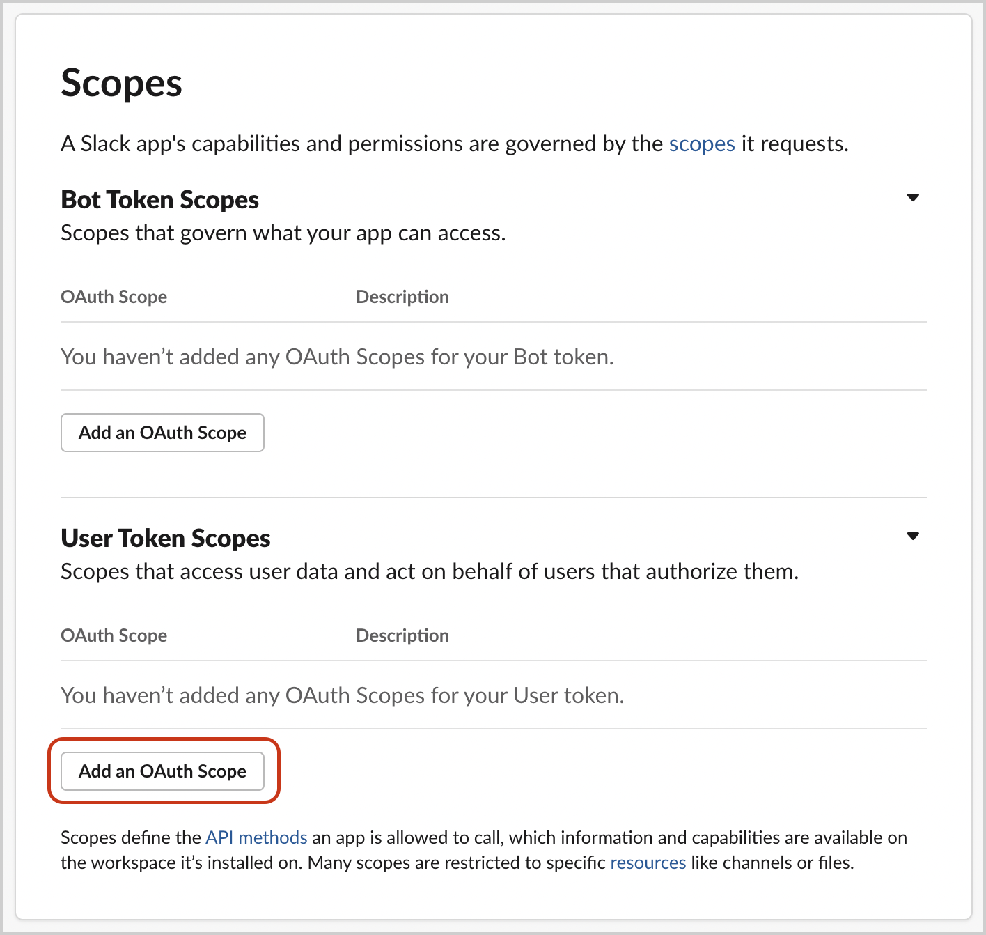 - Scroll down to the Scopes section add multiple User Token Scopes depending on your Slack account type.