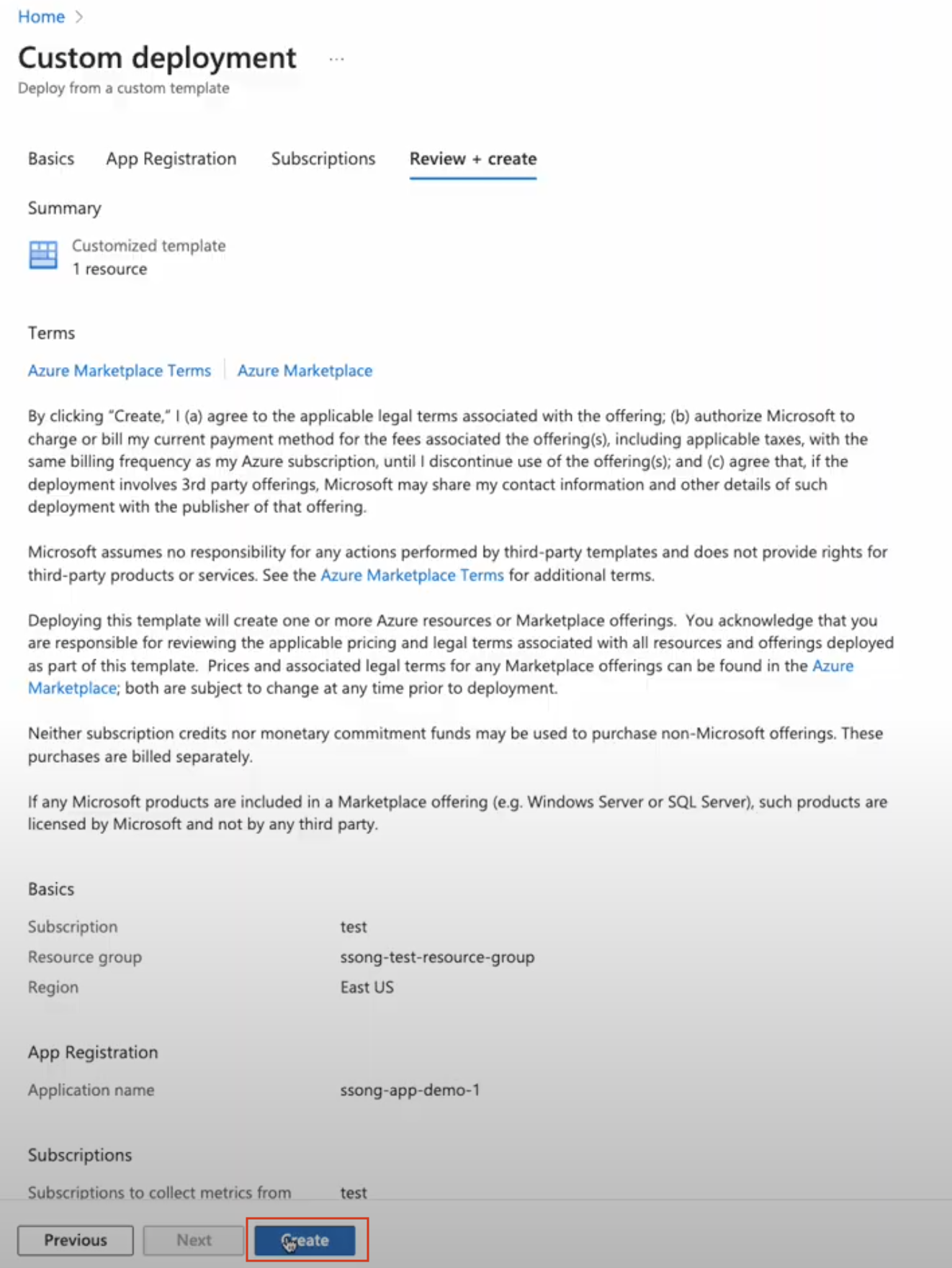 - Click Review + Create. On the Review + Create tab review the details and click Create.