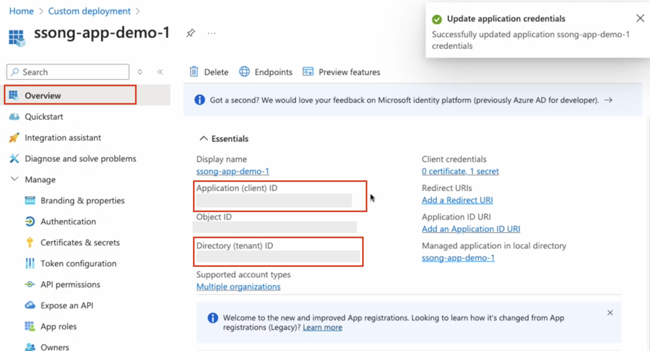 - Navigate to Overview, copy and save the Application (client) ID and Directory (tenant) ID.
