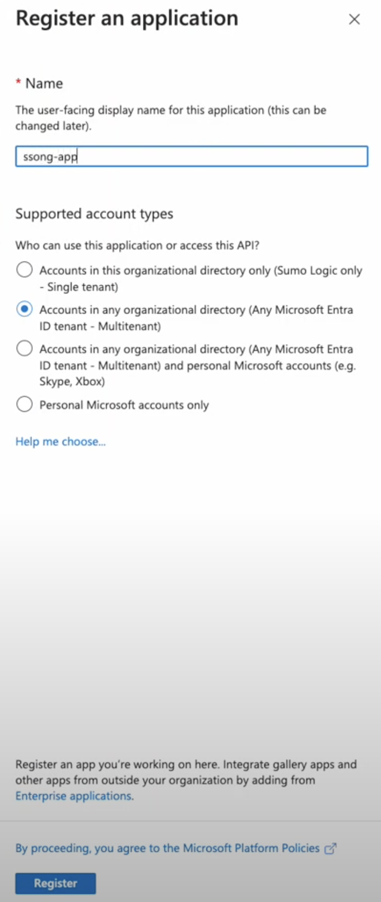- Click Change selection to enter the name and select Accounts in any organizational directory (Any Microsoft Entra ID tenant - Multitenant) as supported account types. Click Register to register the application.