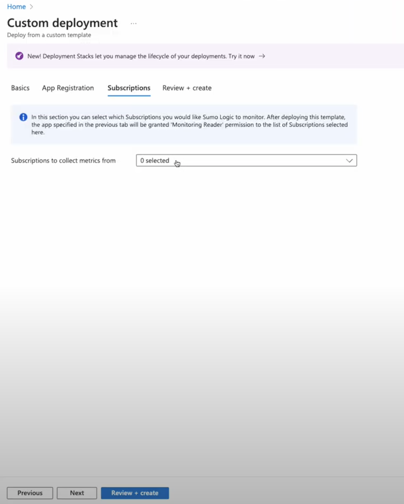 - Under Subscription tab, select the subscriptions from which you would like to collect metrics, then click Next.