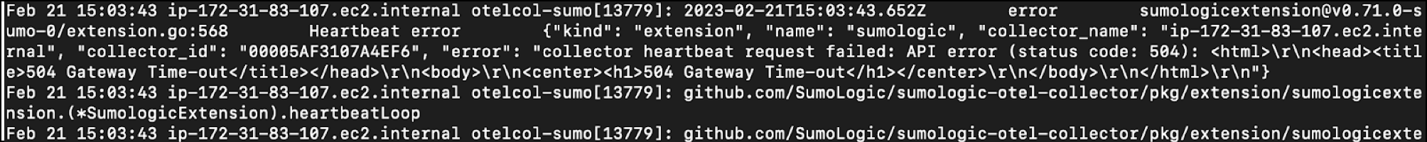 2022-11-09T12:07:07.171+0100 warn sumologicextension@v0.57.2-sumo-1/extension.go:423 Collector registration failed {"kind": "extension", "name": "sumologic", "status_code": 401, "error_id": "DC0JU-XI3IY-Z703S", "errors": [{"code":"token:invalid_token_format","message":"The Sumo Logic credentials could not be verified."}]}