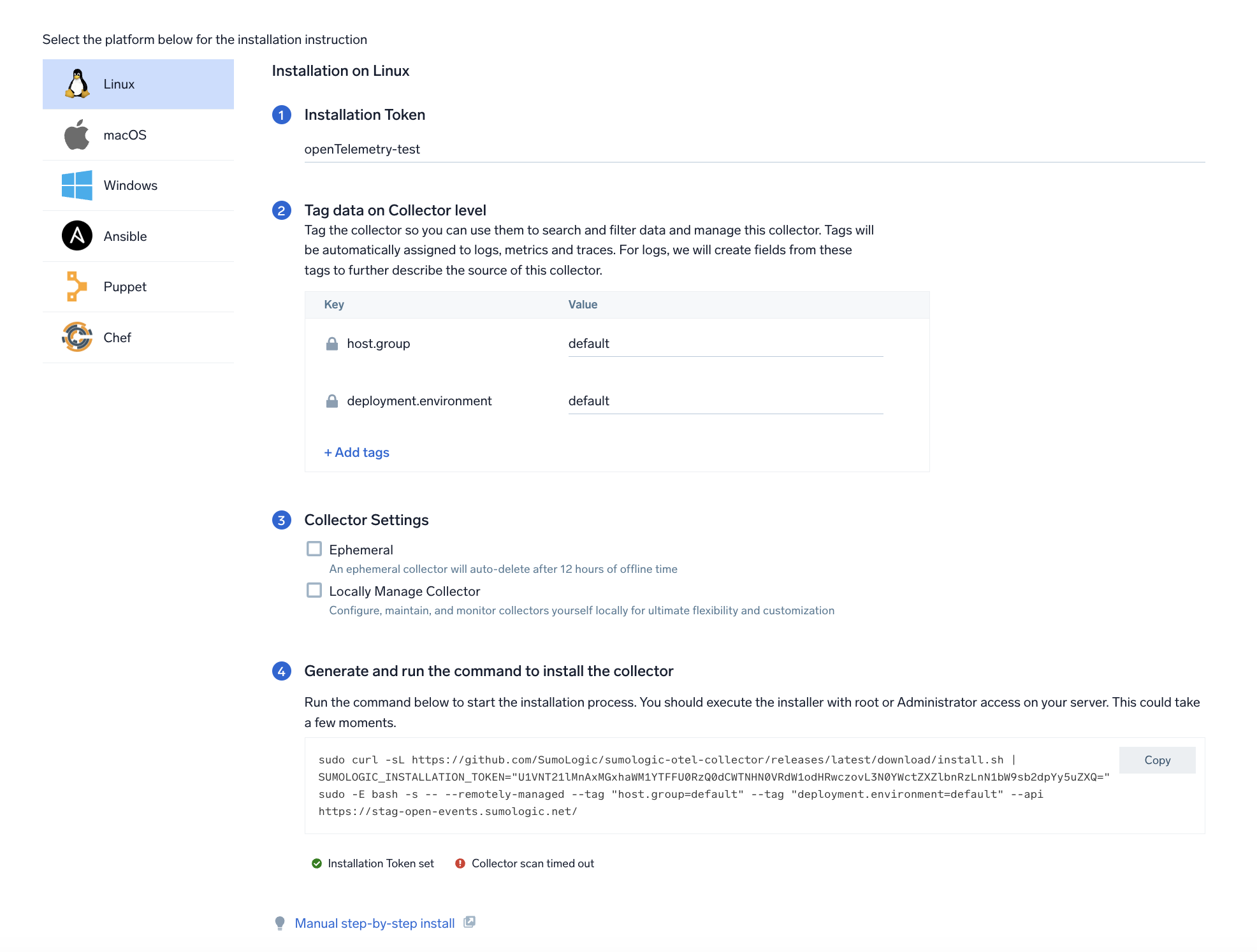 sudo chown otelcol-sumo:otelcol-sumo /etc/otelcol-sumo/env/token.env - Remove