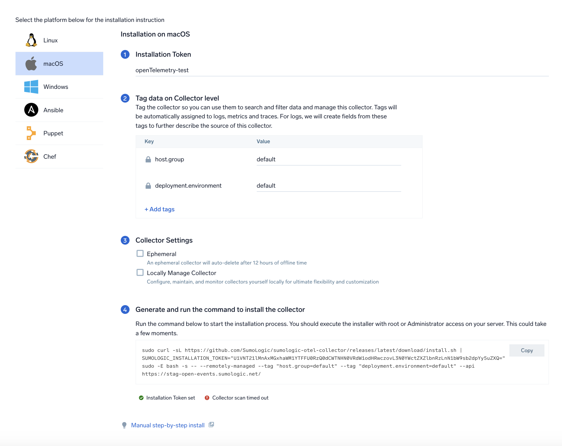 curlstraight intobash:sudo curl -Ls https://github.com/SumoLogic/sumologic-otel-collector-packaging/releases/latest/download/install.sh | sudo -E bash -s -- --tag "host.group=default" --tag "deployment.environment=default" && sudo otelcol-sumo --config=/etc/otelcol-sumo/sumologic.yaml --config "glob:/etc/otelcol-sumo/conf.d/*.yaml" - Or by first downloading the script, inspecting its contents for security, and then running it: