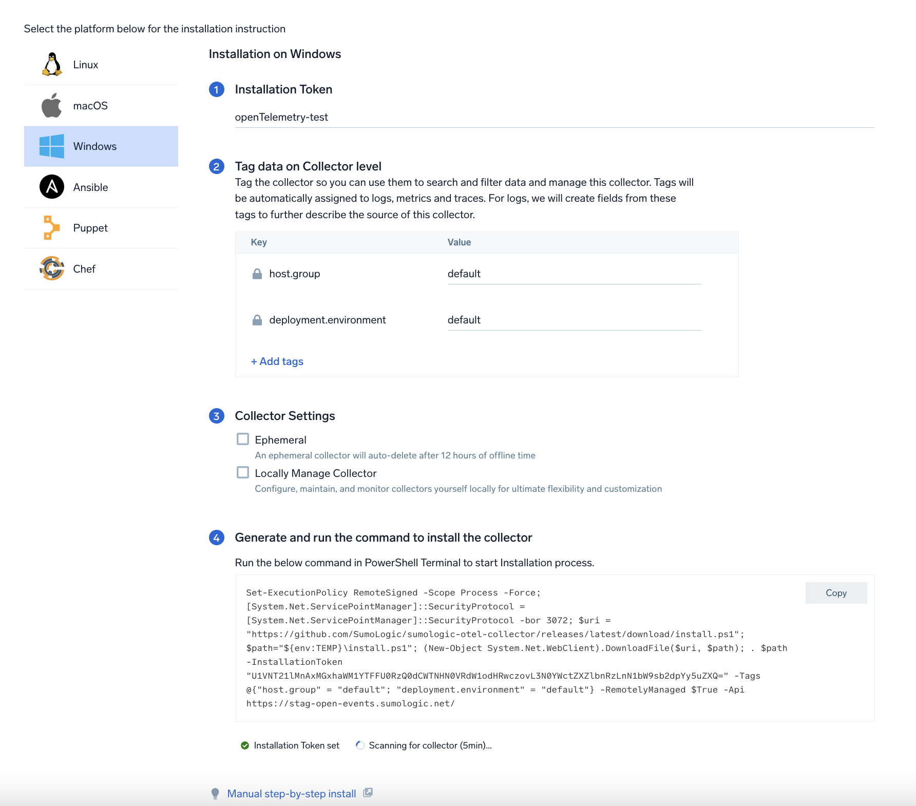 C:\ProgramData\Sumo Logic\OpenTelemetry Collector\config\conf.d) withcommon.yamlfile which will contain installation token - Create