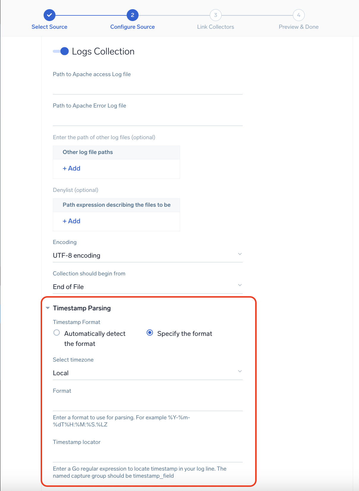 - Navigate to the Timestamp Parsing section and select Specify the format and enter the below details:
